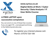 Xyrius Group is delivering IT / Digital skills courses across Salford. These courses are free to unemployed Salford residents, over 19 years old. The courses take 3 weeks to complete, running from Monday to Friday 10am - 2:30pm.